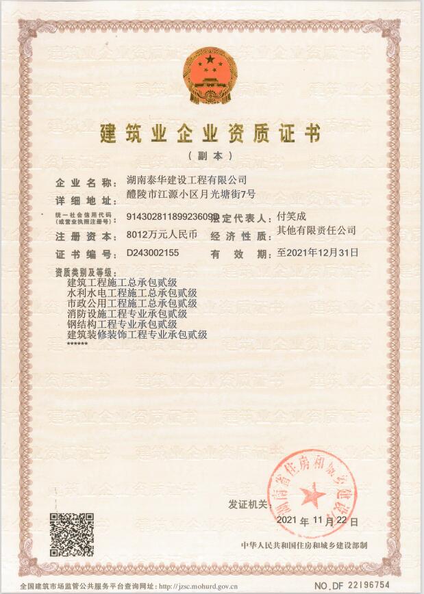 湖南泰華建設工程有限公司一家房屋建筑工程施工總承包貳級,水利水電工程施工總承包貳級,市政公用工程施工總承包貳級,鋼結構工程施工專業承包二級,消防設施工程專業承包貳級,建筑裝修裝飾工程專業承包貳級;公路工程施工總承包叁級,鋼結構、體育設施、環保工程、公路路面工程、公路路基工程專業承包叁級企業。…